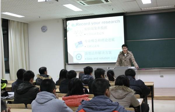 首先为现场同学进行讲座的任仁同学结合自己的科研经历,将自己的经验总结为“三个笔记本”(实验记录本、文献记录本、新想法记录本)以及“三个D”(Discussion、 Debugging 、Discover),他认为科研成功的关键在于记录点滴和抓住想法。紧接着做报告的是李洁同学,李洁同学有着丰富的数学建模经验,她结合自身经历讲解了有关数学建模的一些问题并号召大家一起去了解数学建模的神奇,在培养自己的数学思维、学会创新的同时也锻炼自己自学的能力和解决问题的能力。随后出场是我院刚刚获得校“天宫杯”研究生创新实验竞赛二等奖的万骏炜同学,他回顾了自己自研究生一年级以来的科研历程,并结合自己参加“天宫杯”研究生创新实验竞赛的感想,告诉大家做科研最重要的就是“相信自己,永不言弃”。接下来报告的是赵阳同学,赵阳同学虽然只是研究生一年级的同学,但已经有过参加国际能源大赛的经历。赵阳同学表示,这次参加国际大赛的经历让她深刻体会到机会来之不易,遇到机会就要牢牢抓住。最后作报告的许德智博士有着丰富的科研经验,他以师兄的身份从如何阅读文献、怎样选题和如何做研究三个方面为现场同学提出了一些建议。许博士的报告内容细致而实用,提出的问题也很有针对性,现场同学都备受启发。