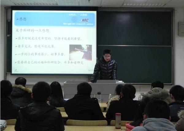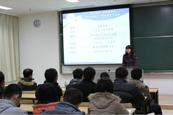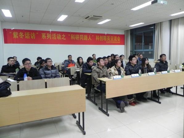 2013年12月10日晚6:30,由欧美色情 研究生会主办的“紫冬话坊”系列活动之“科研同路人”科创精英交流会活动在A18楼218教室顺利举行。本次活动邀请到我院硕士研究生任仁、李洁、万骏炜、赵阳以及博士研究生许德智五位学术精英为到场同学们作报告,研究生辅导员刘斐文老师也莅临现场出席了本次活动。