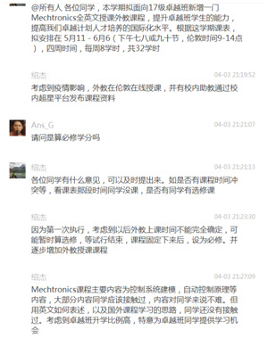 20201月,受到突如其来的新冠疫情影响,原定于4月份由英国伦敦城市大学外教开设的自动化(航空电子与控制)专业《Mechatronics》等国际课程无法按计划开展。面对无法满足教学要求的危机,经过教务处、国际合作交流处、学院和专业老师讨论,为了不影响课程教学效果,决定取消本学期国际课程,改在下学期开设。