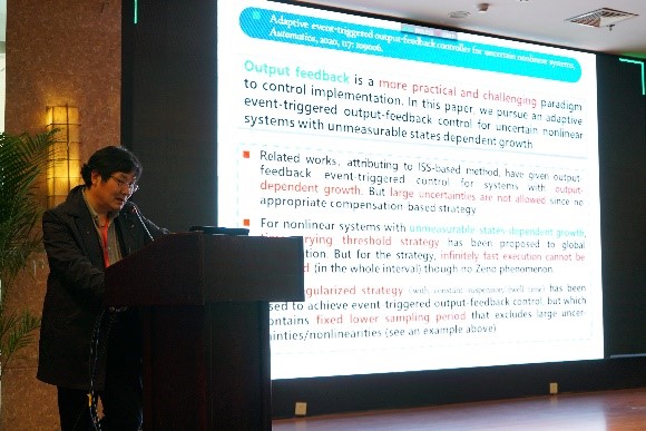山东大学刘允刚教授做了题为“自适应事件触发控制:分析与设计”的报告。介绍了可网络通信和大规模分布式架构的背景,指出共享资源高效利用的迫切性和必要性;针对不同事件触发架构,介绍几种不确定非线性系统的自适应事件触发控制分析与设计方案,以及如何利用动态高增益和切换策略抵御非线性、不确定性和采样误差从而实现全局事件触发镇定。