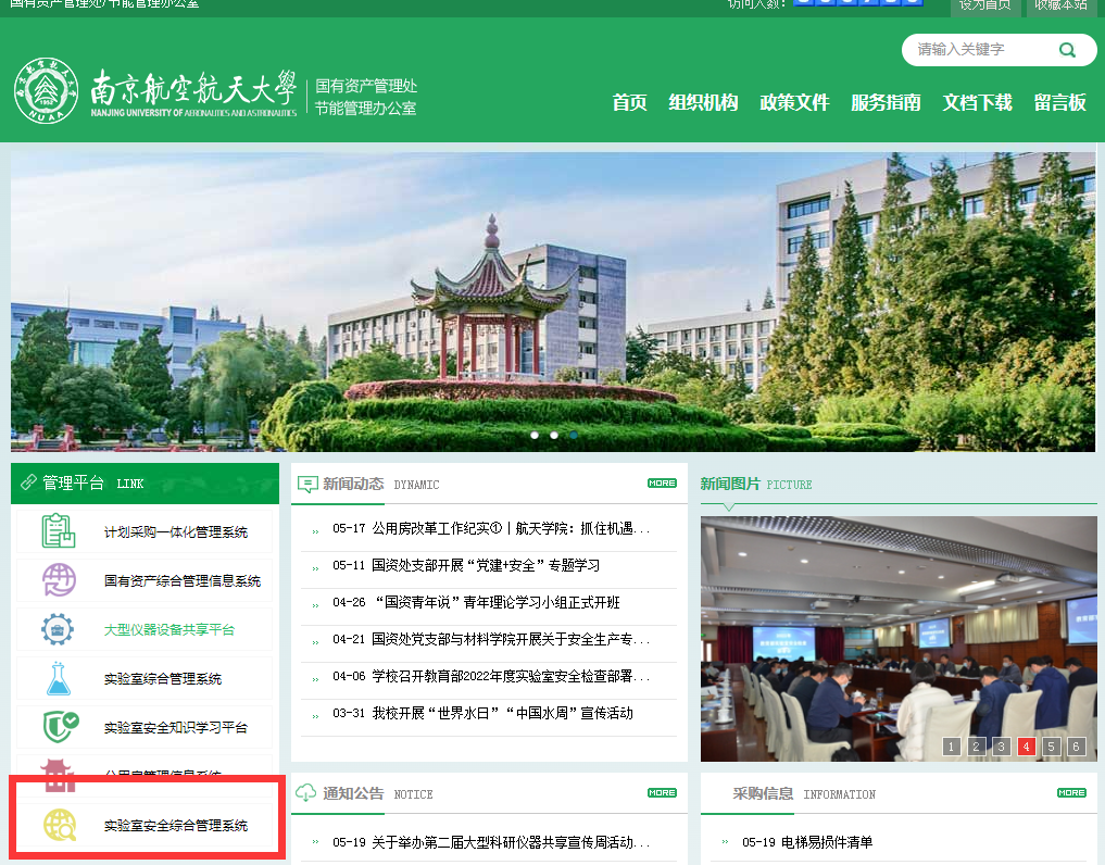 1.输入网址:gzc.oumeiseq.com,访问国资处网站,点击“管理平台”栏目-“实验室安全综合管理系统”,采用校内统一身份认证的方式登录,具体操作如下图: