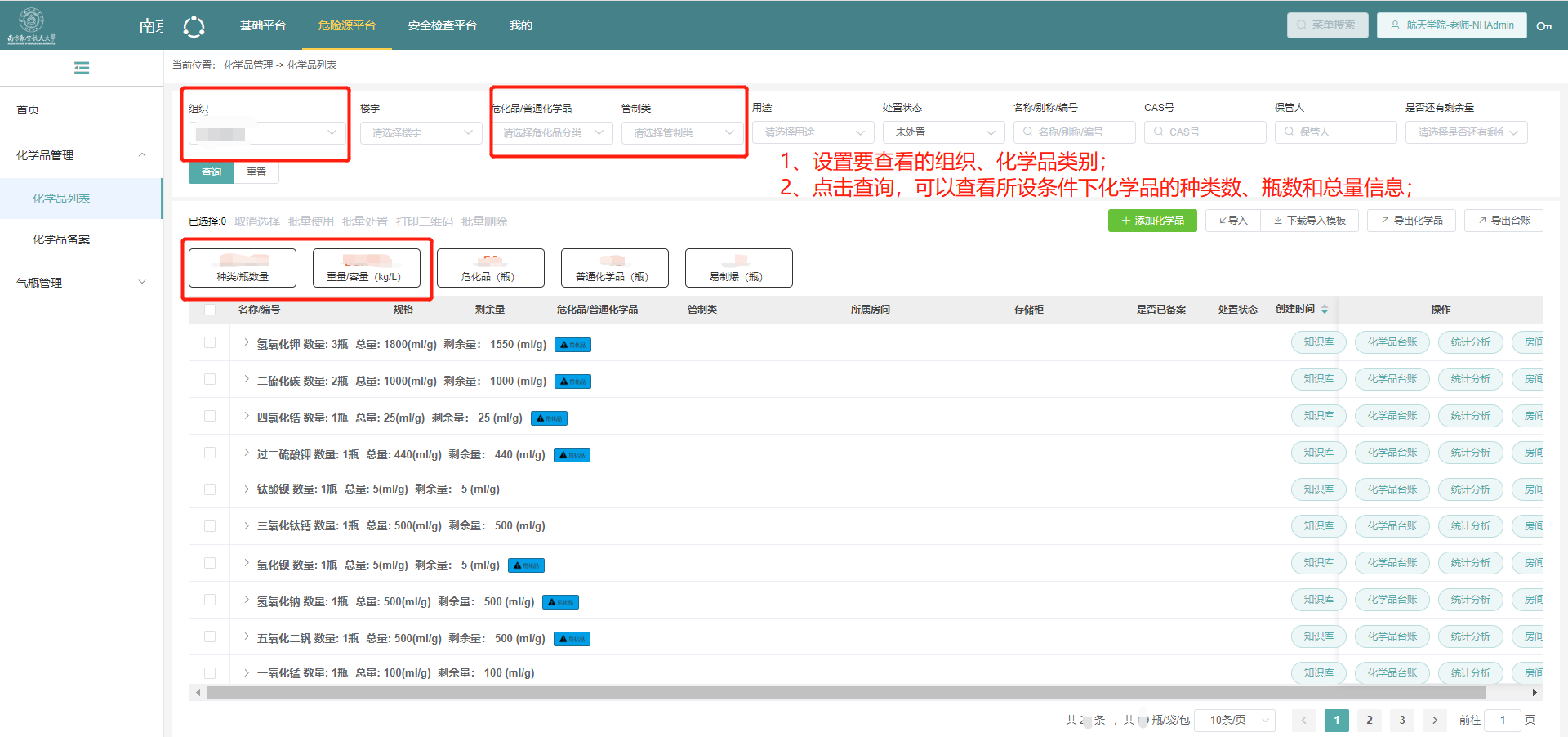 在PC端,化学品列表中,可以设置自己所属的单位以及化学品的类别,查看化学品的种数、数量和总量;此处是实时数据;
