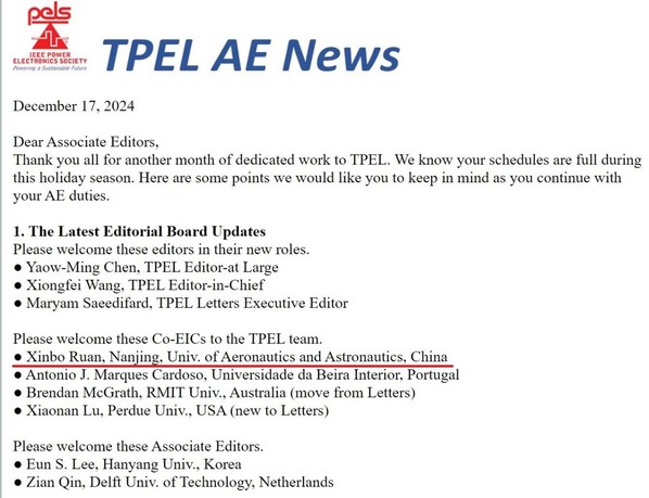 近日,电力电子领域国际顶级期刊IEEE Transactions on Power Electronics(TPEL)正式公布了新任命的Editor-in-Chief (EIC)、Co-EIC与Associate Editor名单。我院电气工程系阮新波教授被任命为Co-EIC,任期自2025年1月开始,为期3年。 阮新波教授曾长期担任IEEE TPEL的Associate Editor。