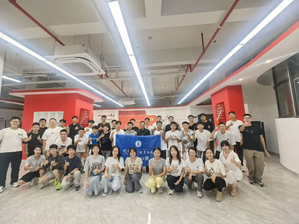 王勤老师、辅导员吴静文老师、0325001班同学与班旗合影
